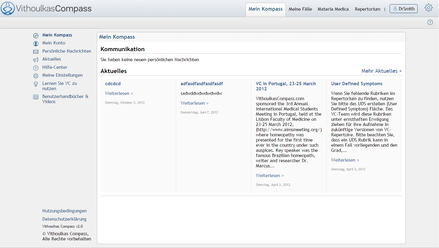 Mein Kompass ist die Willkommensseite auf der Neuigkeiten und persönliche Nachrichten angezeigt werden. Die Menüleiste links ermöglicht den Zugang zu verschiedenen VC Funktionen für: